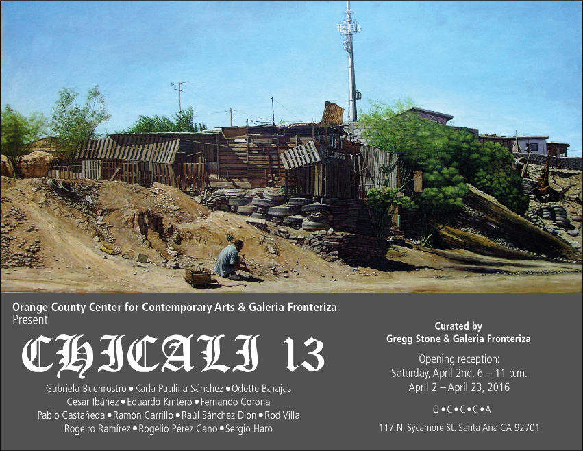 April 2-23, 2016 Opening Reception: Saturday, April 2nd 6-10pm Curated by Gregg Stone and Galeria Fronteriza A collective show of thirteen Mexicali artists, ranging from second and third generation artists, to emerging newcomers, all depicting border life in their work. Made up word Chicali, a diminutive of Mexicali, and the number 13, Featuring work in the following medias: painting, drawing, photograph, graphic art and sculpture/installation. Featured Artists: Catalog & price list of artwork