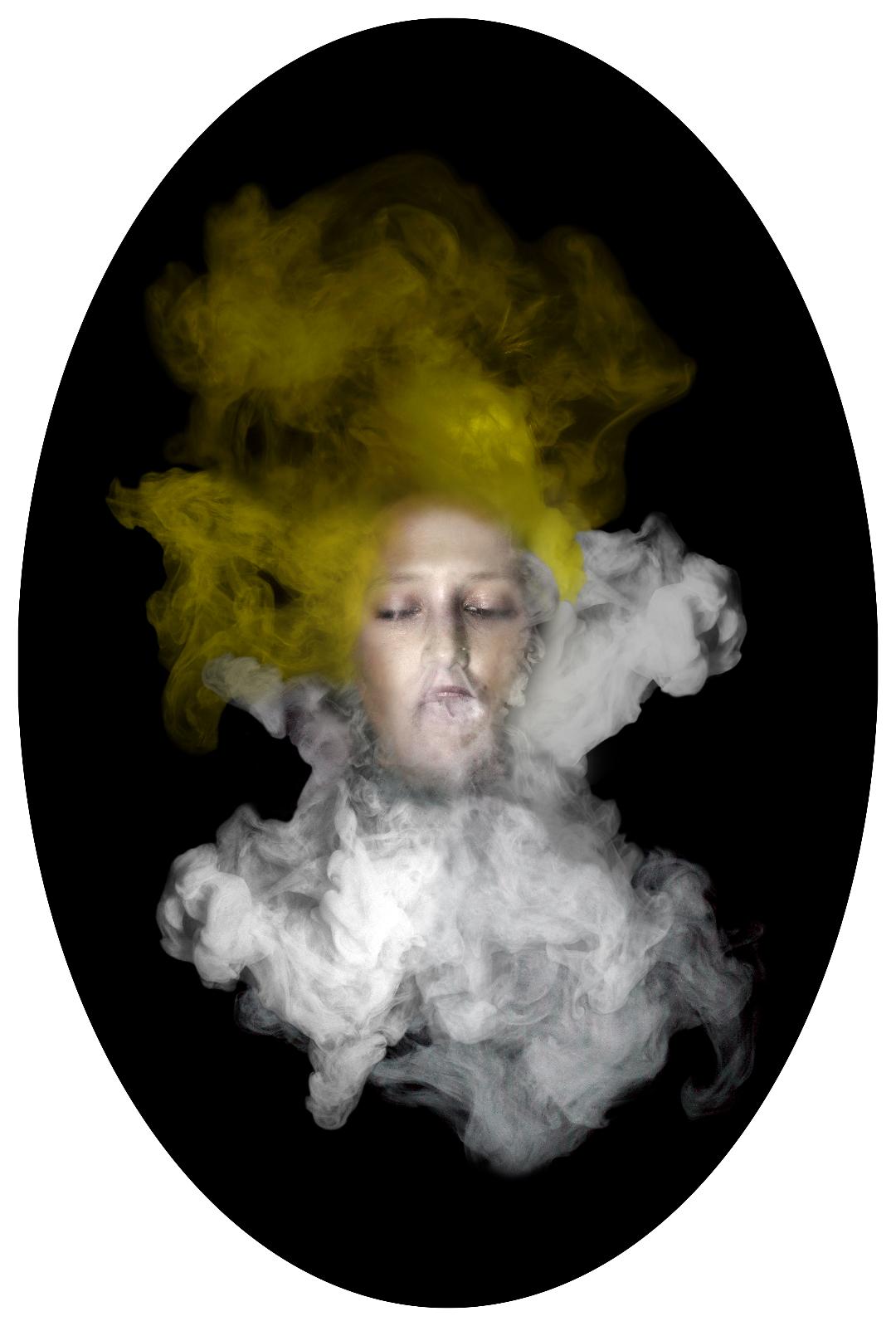 The newest series at the heart of the show is “Chasing Clouds” (2019), which explores the visual manifestation of a breath pattern. The works suggest ectoplasm, escaping spirits, auras, chakras, energy fields, and the dissolution of the self. The title is inspired from a vaping subculture that references the practice of exhaling large amounts of vapor to produce complex formations for the purpose of competition or spectacle.