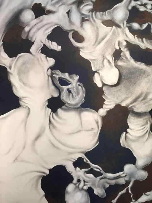 Hayner’s current work is populated with flowing organic forms that express his fascination with the physical, biological processes of birth, growth and transformation and the relationship those processes have with the passage of time. He describes the work as “an imagined rhizome-based biology, intended to suggest, rather than depict, growing life forms, such as bones, organs or stones, seemingly arrested in a moment of time.” He further explains that… “the work is, at its core, a product of imagination, but it was inspired by a real-life experience. While viewing the sonogram of our baby when her mother was twenty-two weeks and two days pregnant, I felt a renewed sense of awe and amazement with the mysterious, tenacious and continually changing physicality of life. That cathartic moment continues to drive the work forward as I experiment with mixing various media, including graphite, charcoal, colored pencil, paint and installation elements. The work continues to grow and change, as do the very life forms that inspire it.”