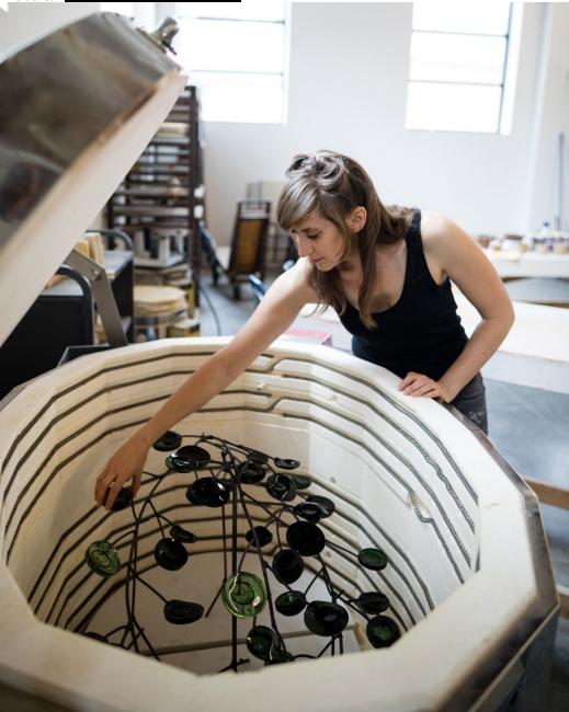 narratives that utilize various materials such as cast, slumped, and found glass, charred steel,