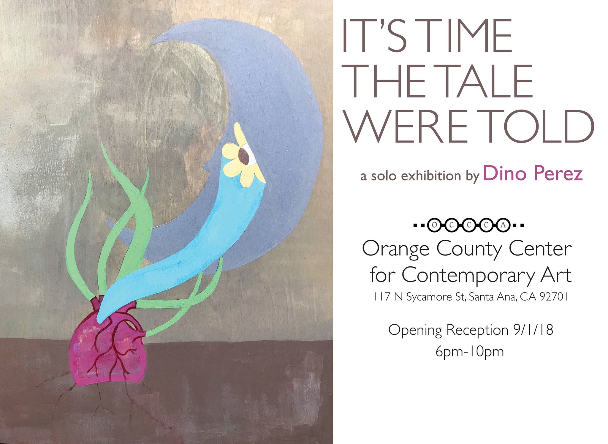 The opening reception for the “It’s Time The Tale Were Told” exhibition is scheduled 6-10pm September 1st, 2018 at the Orange County Center for Contemporary Art (OCCCA). The solo exhibition will be featured at OCCCA from September 1st through September 22nd, 2018. For more information call Dino Perez at 714-673-8479 or email dino@dinoperez.com.